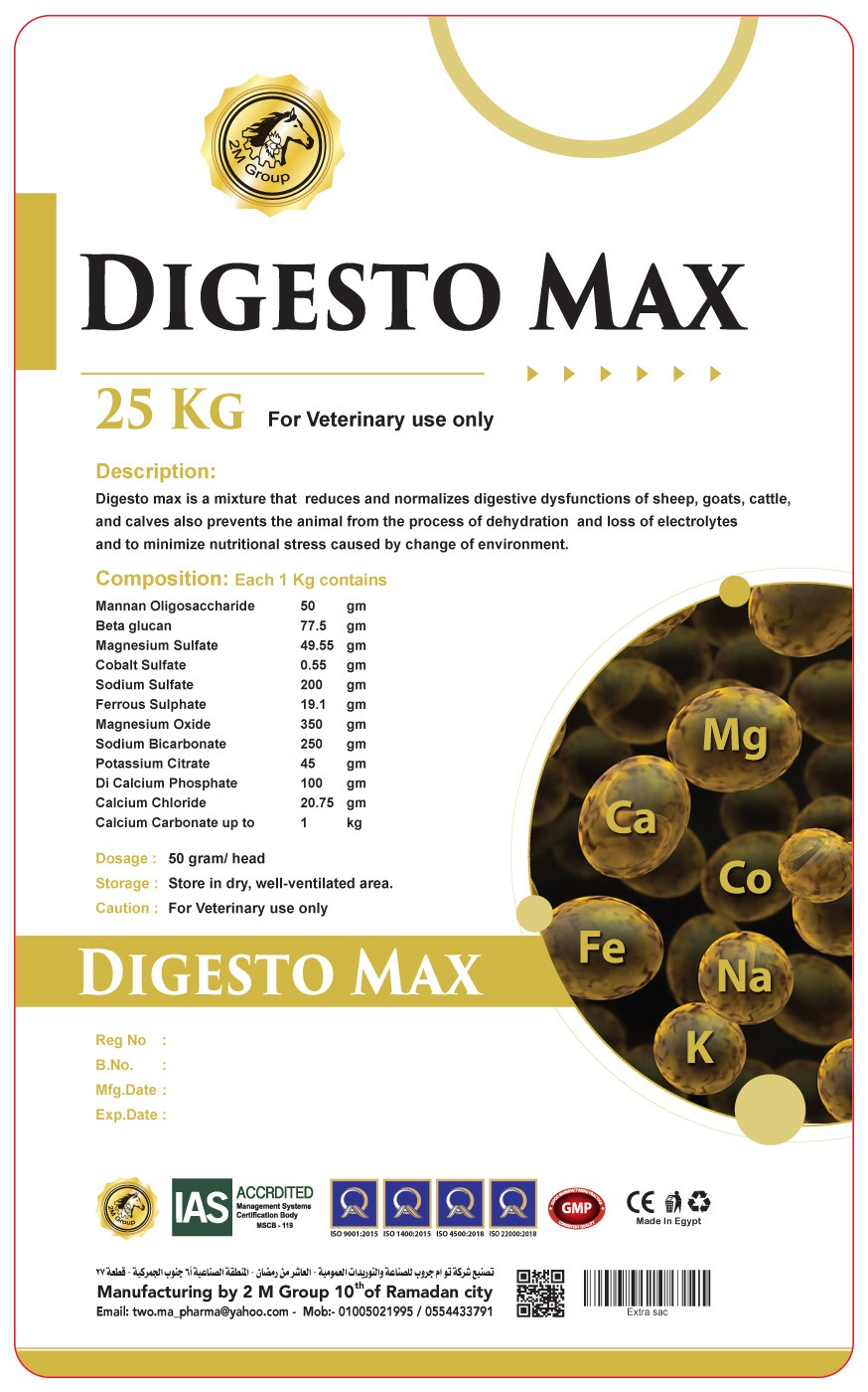 Digesto max is a mixture that  reduces and normalizes digestive dysfunctions of sheep, goats, cattle, and calves also prevents the animal from the process of dehydration and loss of electrolytes and to minimize nutritional stress caused by change of environment.