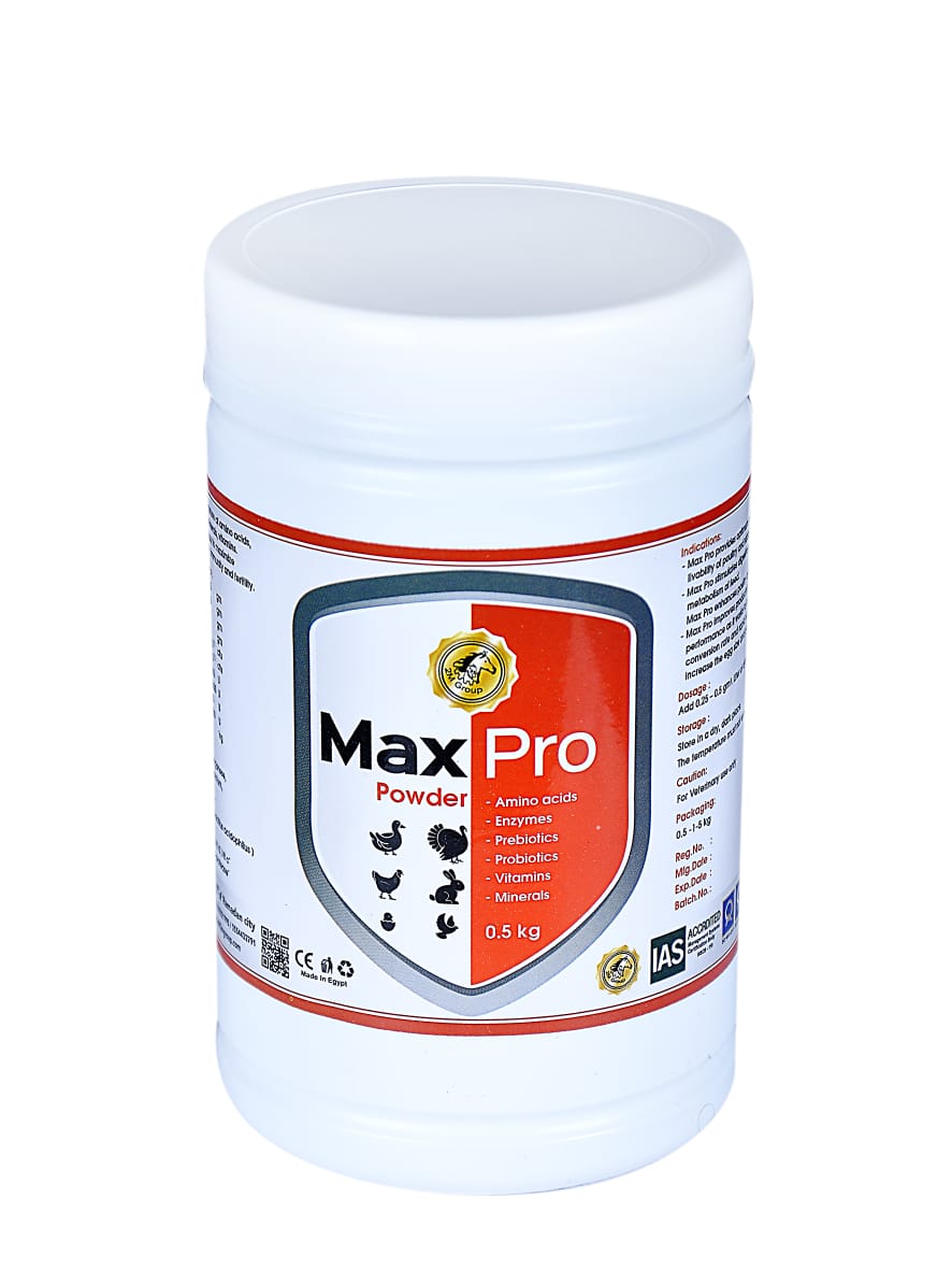 Max Pro is a great mixture of amino acids, enzymes, prebiotics, probiotics, minerals, vitamins. It works to full fill the nutritional gaps, to maximize production and to improve poultry immunity and fertility